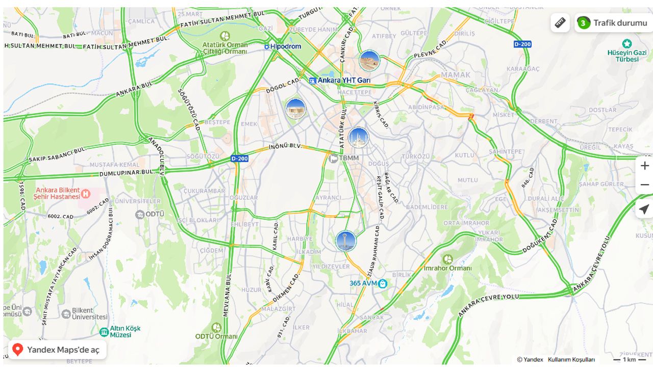 Şehir merkezine yaklaşıldığında ise Kızılay, Sıhhiye, Ulus ve TBMM çevresi gibi bölgelerde yer yer orta yoğunlukta trafik dikkat çekiyor. Bu noktalarda kavşaklar ve bağlantı yollarında kısa süreli yavaşlamalar yaşansa da trafiğin durma noktasına gelmediği görülüyor.