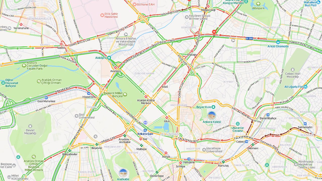 Şehir merkezine yaklaşıldıkça tablo daha da belirginleşiyor. Ulus, Sıhhiye ve Ankara Garı çevresinde trafik orta ve yer yer yoğun seviyede seyrediyor. Bu bölgelerde kavşak yükü ve gün içi hareketlilik etkili oluyor.