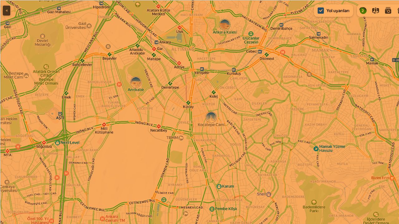 Haritada ana arterlerin büyük bölümünün yeşil ve açık tonlarda yer alması şehir genelinde trafiğin normal seyrinde olduğunu gösteriyor. Sadece bazı kavşak ve bağlantı yollarında kısa süreli yavaşlamalar gözlemlenirken bunların genel akışı etkileyecek boyutta olmadığı anlaşılıyor.