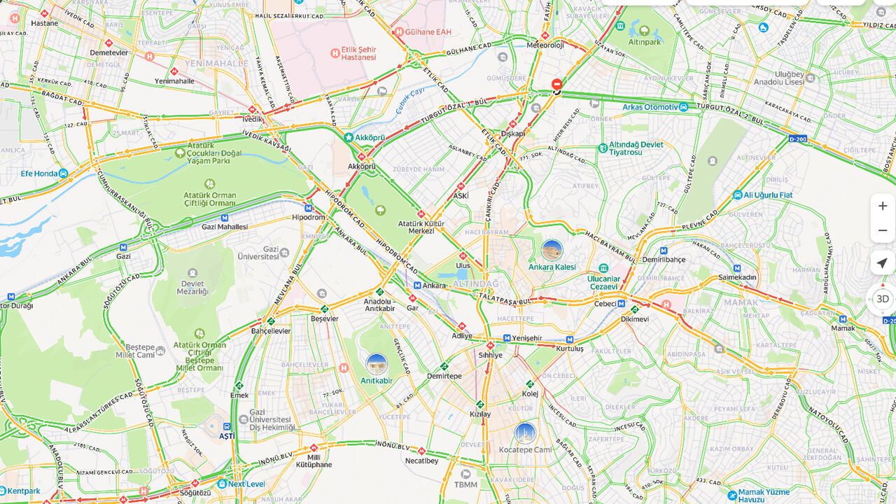 Batı tarafında Söğütözü, Beştepe, Anadolu Bulvarı ve Eskişehir Yolu bağlantıları genel olarak akıcı görünse de kavşak noktalarında yavaşlamalar haritada yer aldı.