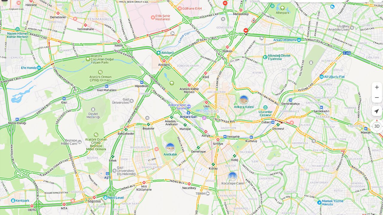 Kent merkezinde de tablo benzer. Kızılay, Sıhhiye, Ulus ve çevresinde trafik zaman zaman yavaşlasa da genel yoğunluk düşük seviyede. Ankara Garı çevresi, Hipodrom Caddesi ve Atatürk Bulvarı gibi kritik noktalarda da ciddi bir tıkanıklık gözlenmiyor.
