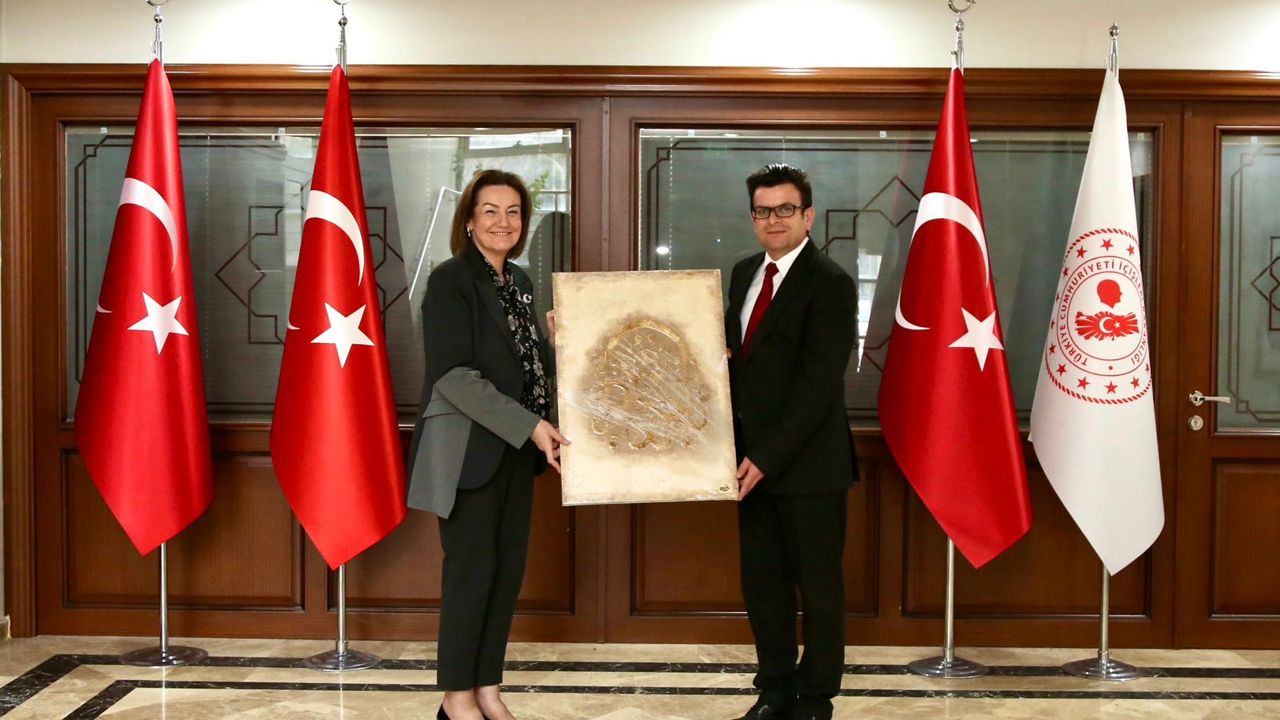 Anlamlı hediye İlçe Milli Eğitim Şube Müdürü Sayın Erkan Mehmet Akar tarafından Kaymakam Gevrek’e sunuldu. Öğrencilerin el emeğiyle hazırladığı hat tablosu hem geleneksel sanatlara verilen önemi hem de projenin kültürel derinliğini gözler önüne serdi.