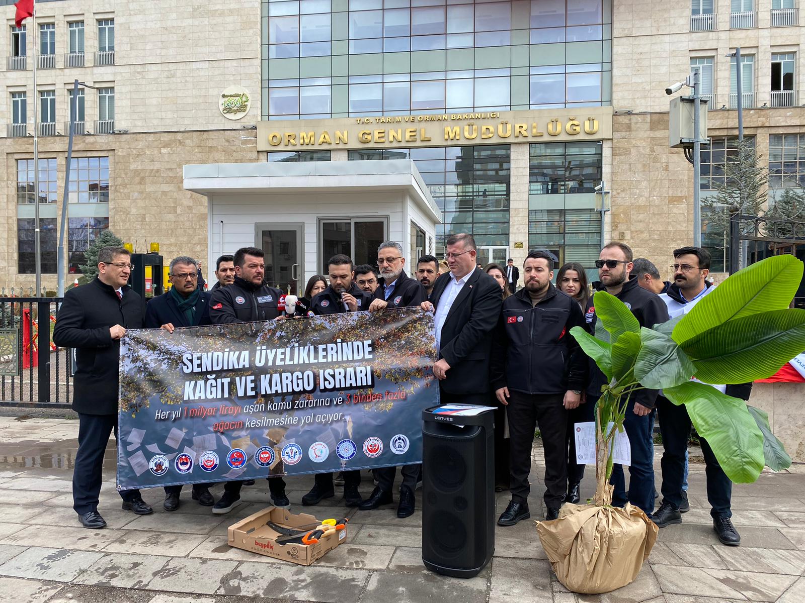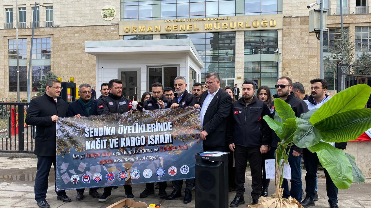 Devlet Memurları Konfederasyonu Genel Başkan Yardımcısı Furkan Ali Çiftçioğlu, Orman Genel Müdürlüğü önünde yaptığı basın açıklamasında, mevcut sendika üyelik sisteminin hem kamu bütçesine hem de çevreye zarar verdiğini söyledi. Çiftçioğlu, Türkiye’de 4 milyondan fazla memur ve sözleşmeli personelin sendika üyeliği veya istifası için çok sayıda basılı evrak doldurmak zorunda kaldığını ifade etti.