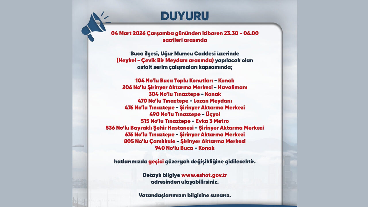 İzmir’de toplu ulaşımı kullanan vatandaşları ilgilendiren önemli bir düzenleme duyuruldu. ESHOT Genel Müdürlüğü tarafından yapılan açıklamaya göre, Buca ilçesi Uğur Mumcu Caddesi üzerinde asfalt serim çalışması gerçekleştirilecek.