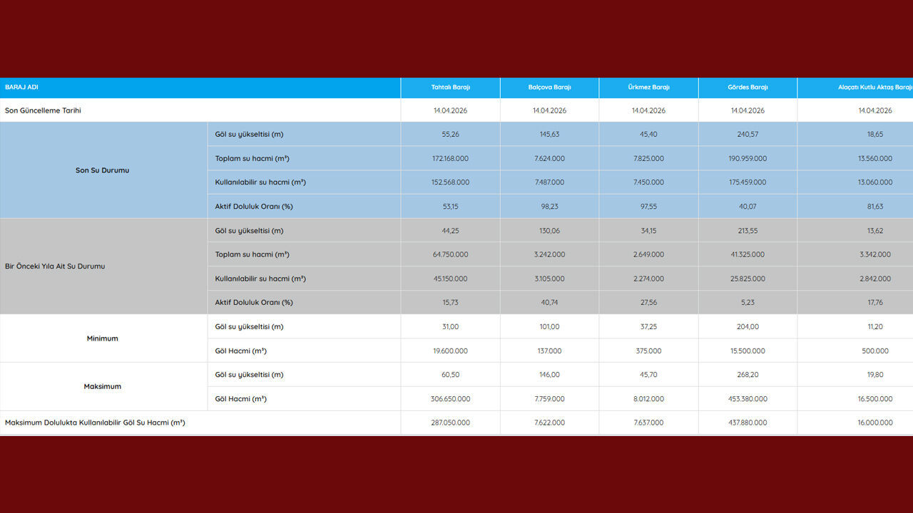 14 Nisan 2026 verileri, İzmir’e su sağlayan beş önemli barajın tamamında geçen yıla göre artış yaşandığını ortaya koydu. Tahtalı yüzde 53,15, Balçova yüzde 98,23, Ürkmez yüzde 97,55, Gördes yüzde 40,07 ve Alaçatı Kutlu Aktaş Barajı yüzde 81,63 aktif doluluk oranına ulaştı.