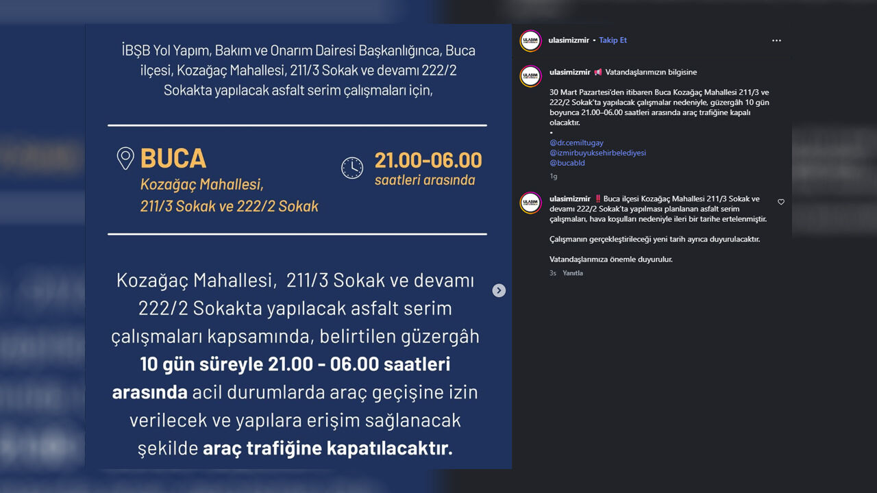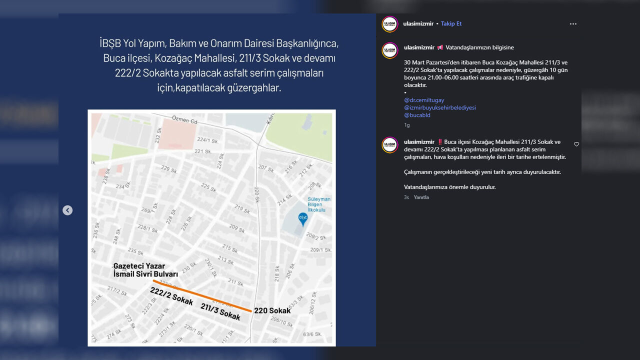 Duyuruya göre, Buca Kozağaç Mahallesi sınırları içinde bulunan 211/3 Sokak ve devamındaki 222/2 Sokak üzerinde asfalt serim çalışması yapılacak.