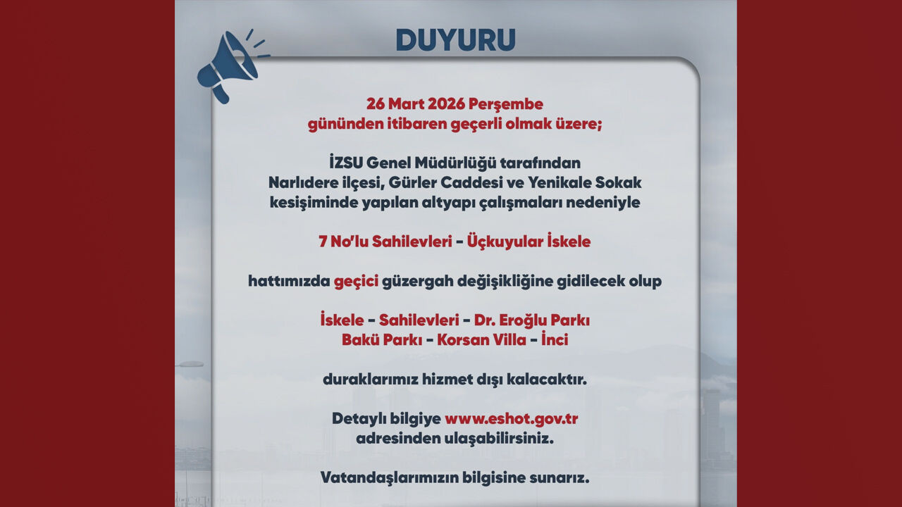 İzmir’de Sahilevleri–Üçkuyular hattını kullanan yolcular için yeni bir ulaşım düzenlemesi devreye alındı. ESHOT’un açıklamasına göre 7 No’lu hattın mevcut güzergahı yerine geçici bir ring hattı oluşturuldu.
