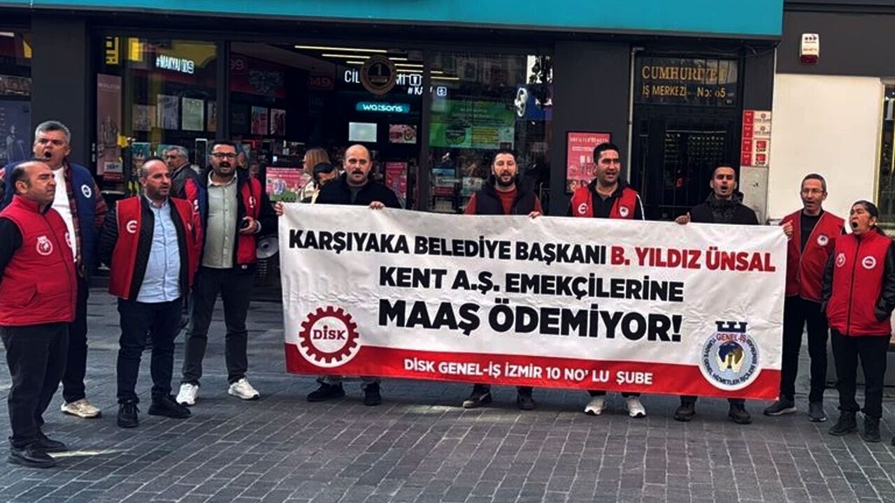 Karşıyaka Çarşısı’nda toplanan KENT A.Ş. işçileri, maaş sorunu nedeniyle eylem düzenledi. Eylem sırasında işçiler, “Alın terimiz gasp edilemez”, “KENT A.Ş işçisi köle değildir” ve “Direne direne kazanacağız” sloganları attı.