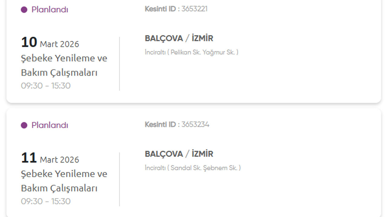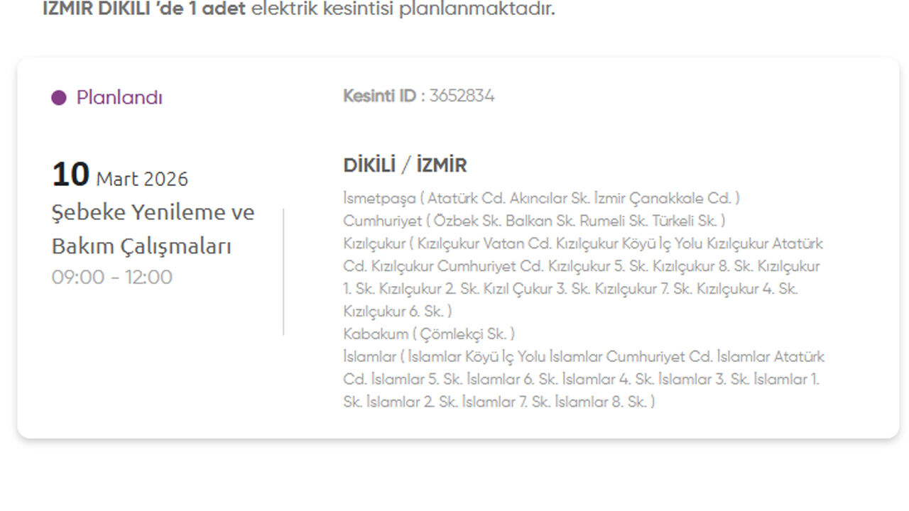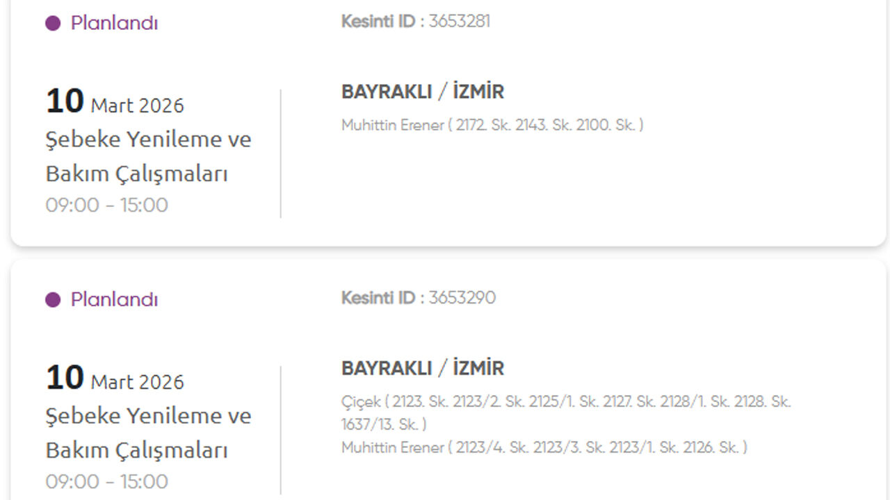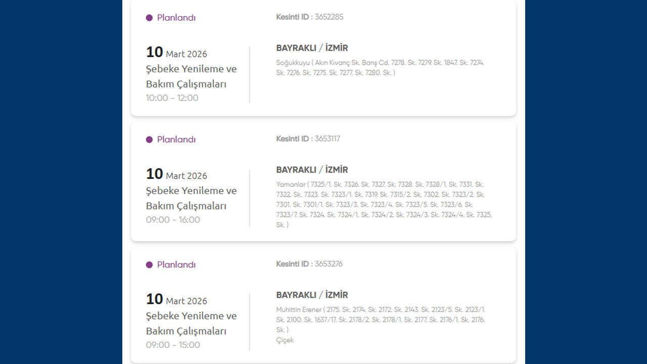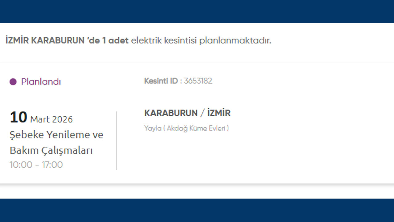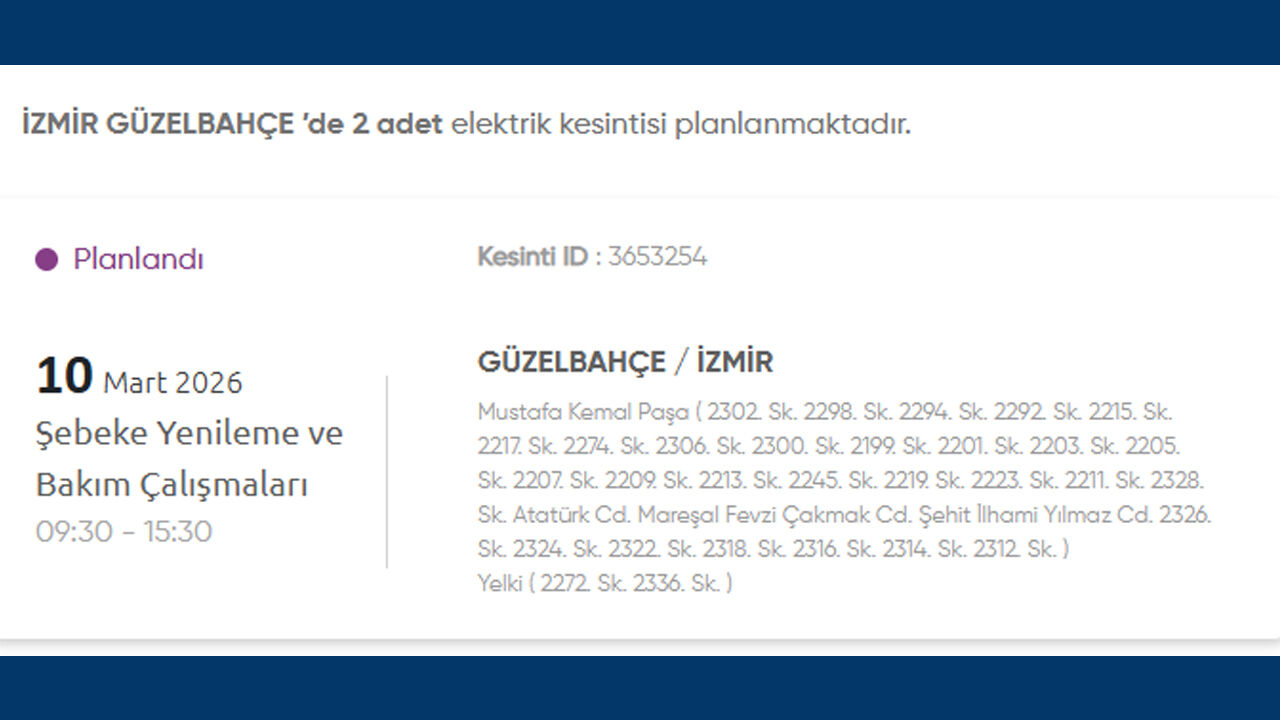Gediz Elektrik Dağıtım, 10 Mart 2026 Salı günü İzmir’in birçok ilçesinde planlı elektrik kesintisi uygulanacağını duyurdu. Kesintilerin şebeke yenileme ve bakım çalışmaları nedeniyle yapılacağı belirtildi. İşte kesinti yapılacak yerler: