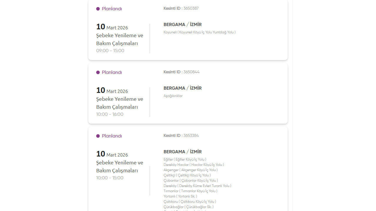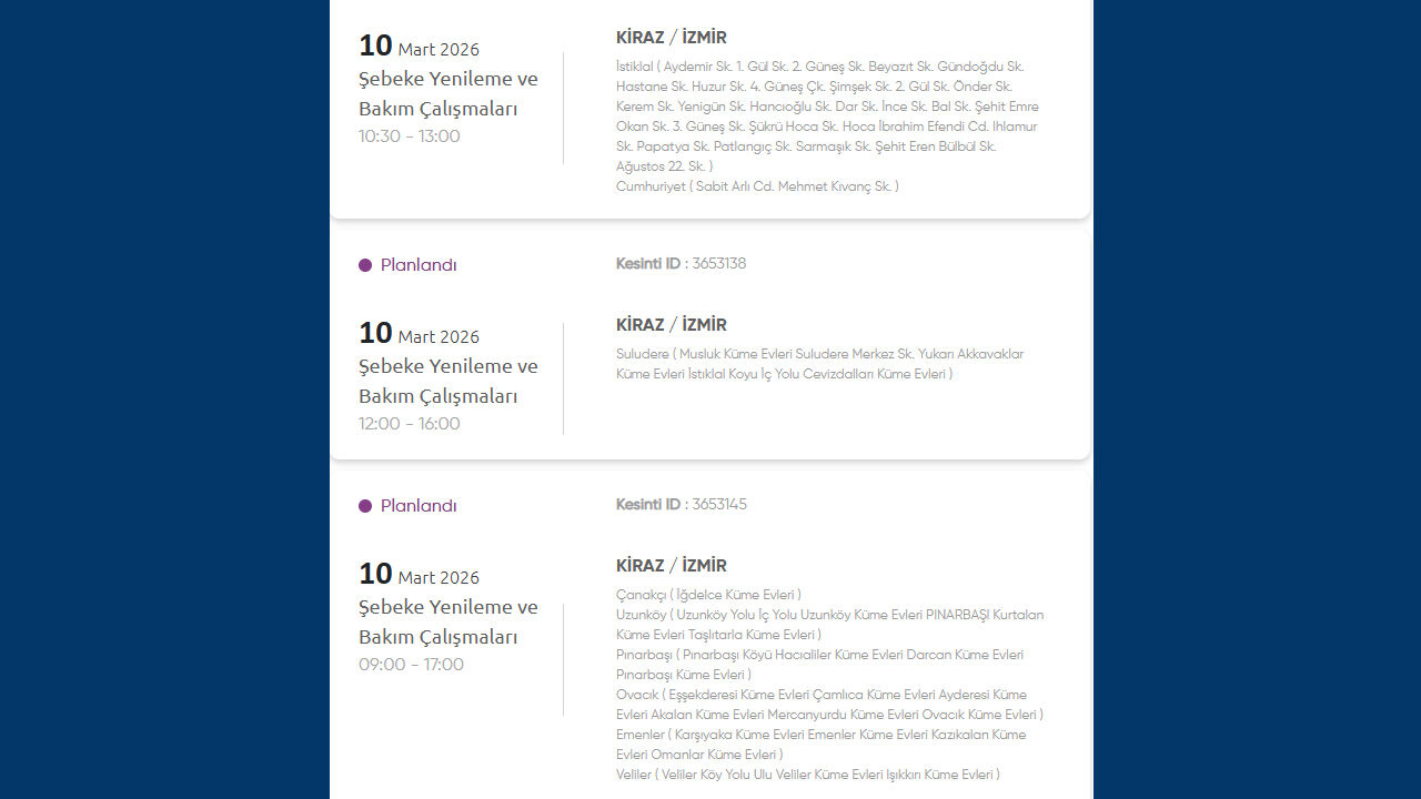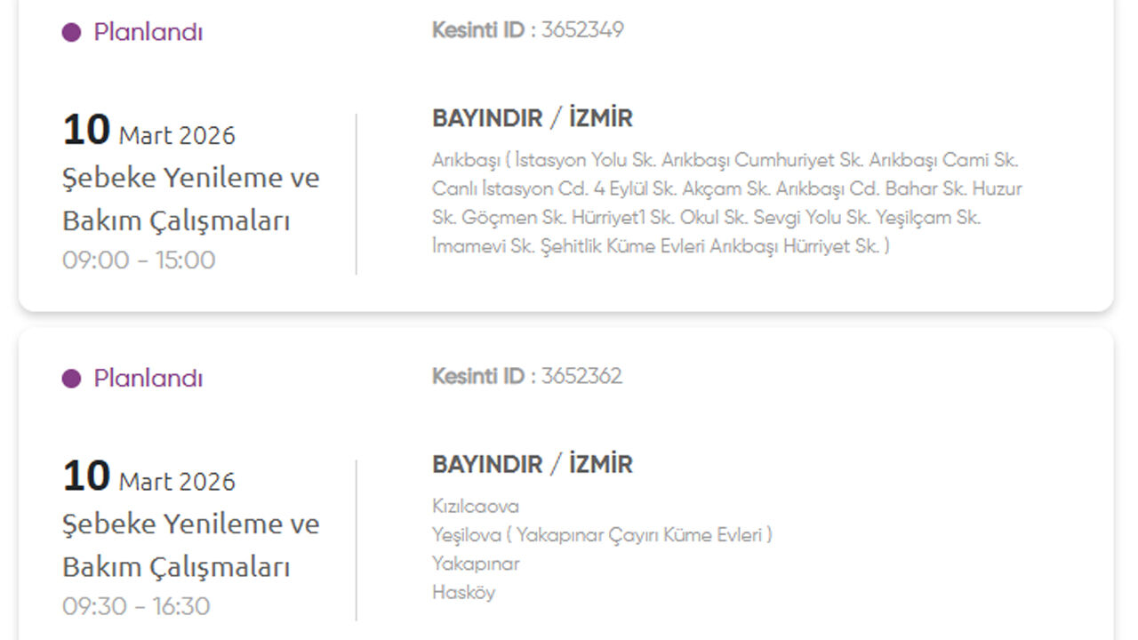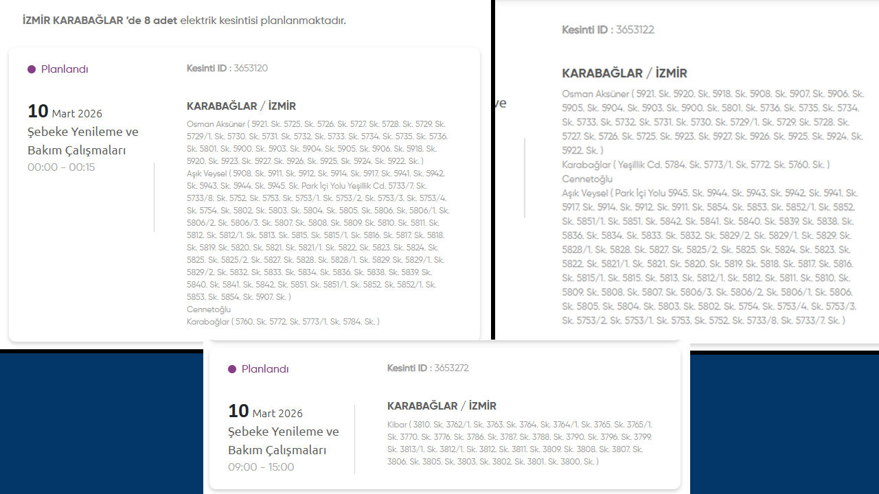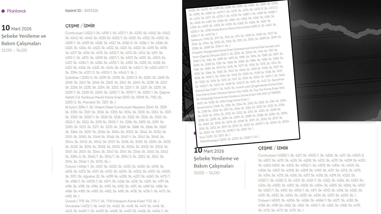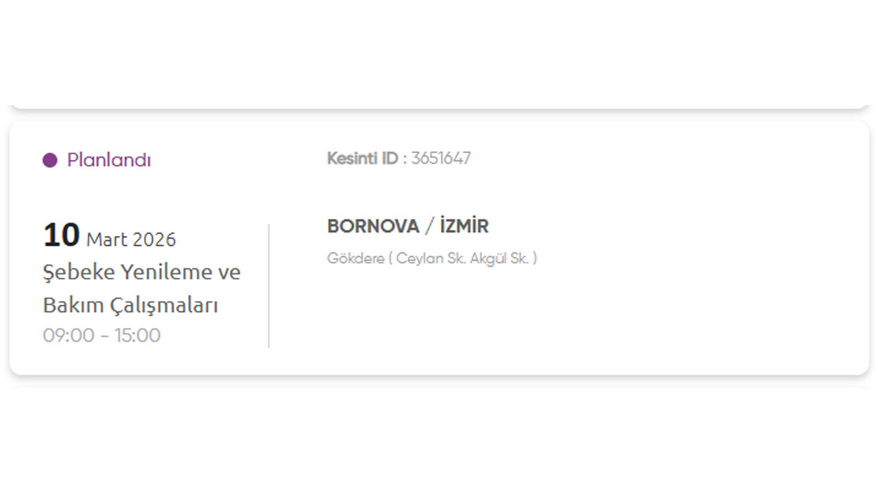 Gediz Elektrik Dağıtım, 10 Mart 2026 Salı günü İzmir’in birçok ilçesinde planlı elektrik kesintisi uygulanacağını duyurdu. Kesintilerin şebeke yenileme ve bakım çalışmaları nedeniyle yapılacağı belirtildi. İşte kesinti yapılacak yerler: