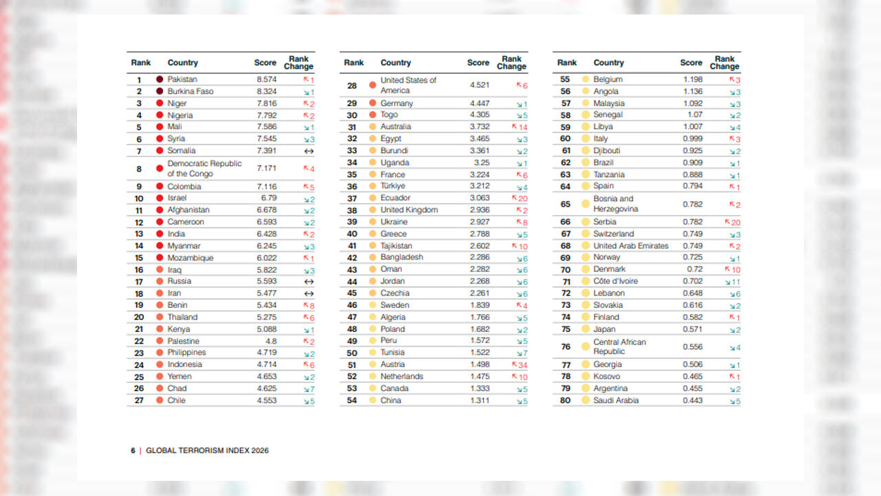 İndeksin ilk sırasında 8.574 puanla Pakistan yer alıyor. Pakistan’ın listenin ilk sırasında yer alması, ülkede son dönemde artan terör saldırıları ve güvenlik sorunlarının hala ciddi bir tehdit oluşturduğunu gösteriyor.