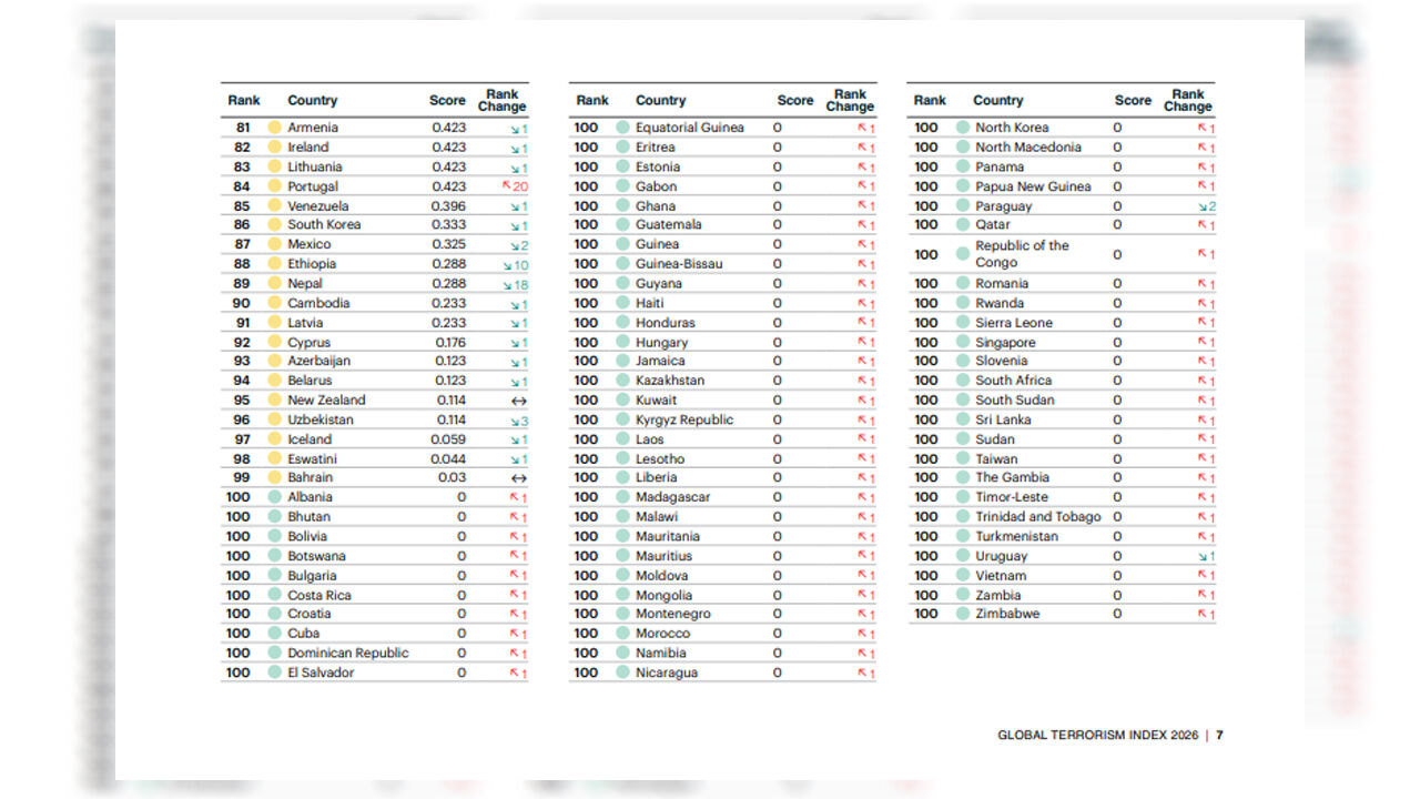 64 ülkenin terörizm puanının sıfır olması, dünya genelinde geniş bir coğrafyada terör tehdidinin ya hiç görülmediğini ya da etkisinin oldukça sınırlı kaldığını ortaya koyuyor.
