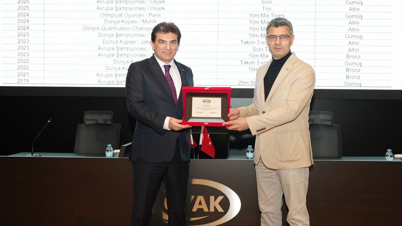 Paris 2024 Olimpiyatları’nda atıcılık branşında kazandığı madalya ile Türkiye’ye Cumhuriyet tarihinde bu dalda ilk olimpiyat madalyasını getiren Yusuf Dikeç, aynı zamanda emekli bir OYAK üyesi. Dikeç’e plaketi, Murat Yalçıntaş takdim etti.