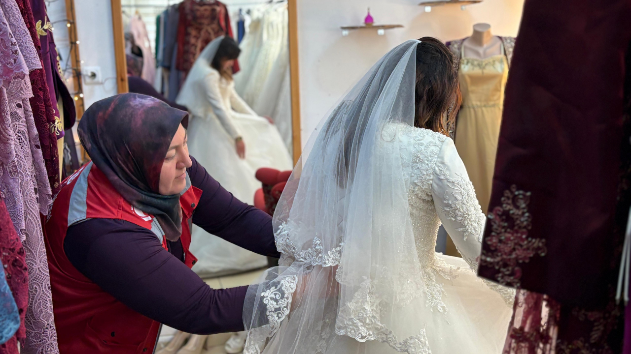Maddi durumu yeterli olmayan çiftler, Hayır Çarşısı’na gelerek gelinlik, bindallı, ayakkabı ve abiye gibi ürünleri ücretsiz şekilde temin edebiliyor.