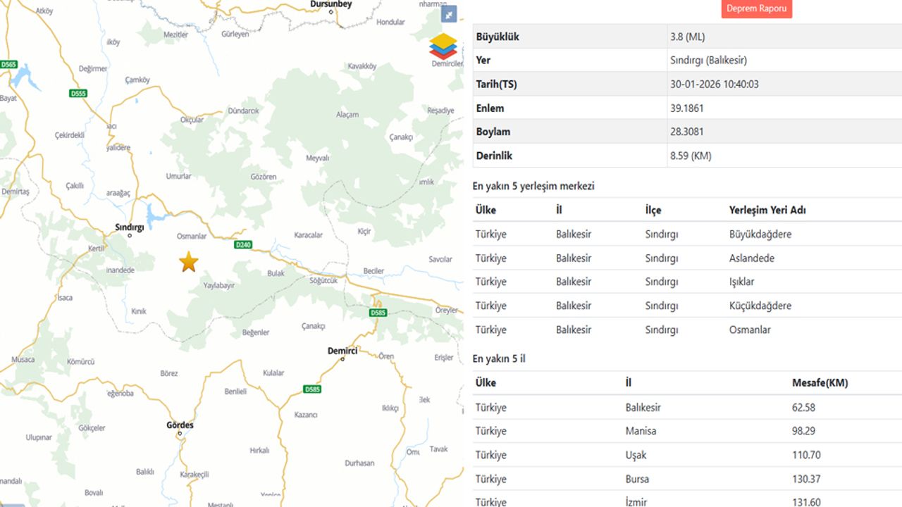 Afet ve Acil Durum Yönetimi Başkanlığı tarafından yayımlanan son listede en yüksek büyüklükteki deprem Balıkesir’in Sındırgı ilçesi çevresinde 3,8 ML olarak kaydedildi. Depremin yaklaşık 9 kilometre derinlikte oluştuğu bildirildi. Aynı bölgede gün içinde birden fazla küçük ölçekli deprem daha ölçüldü.