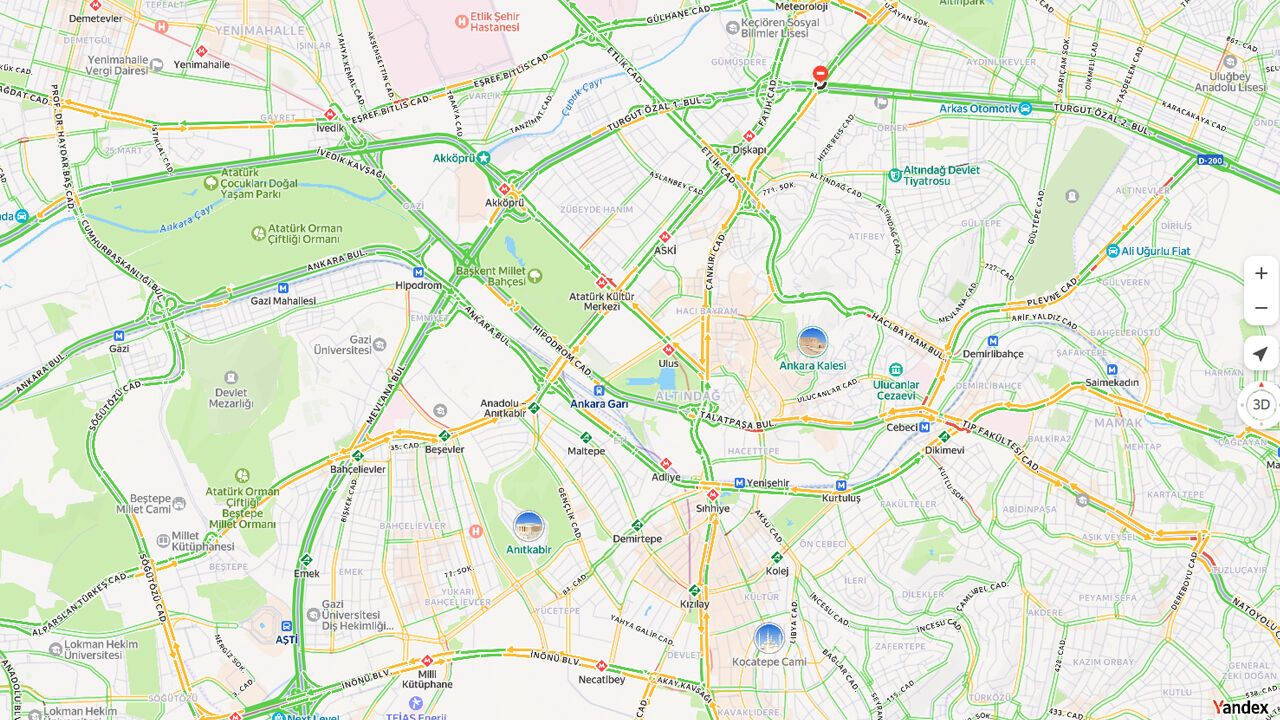 Ankara Büyükşehir Belediyesi’nin paylaştığı yol durumu haritasında bazı noktalarda trafik akışı tamamen durduruldu. Bu yollar haritada kırmızı daire içinde beyaz yatay çizgi simgesiyle işaretlendi.