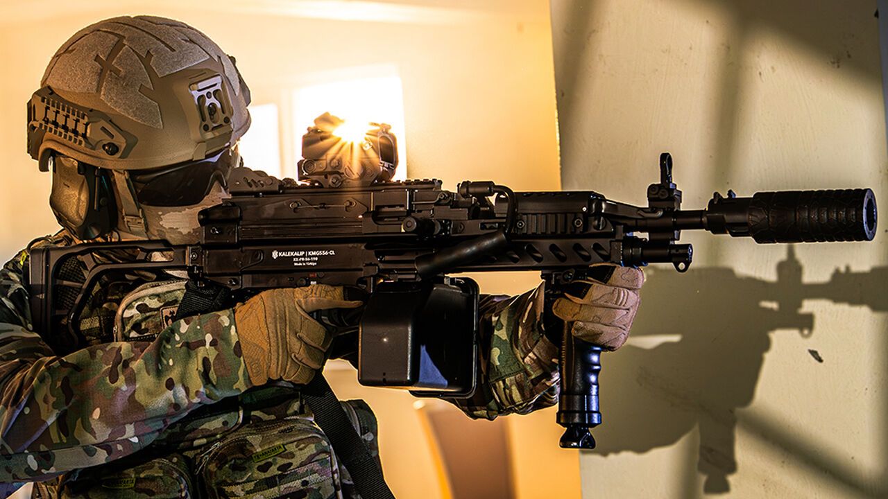 Türk savunma sanayii şirketlerinden KaleKalip, geliştirdiği KMG556 hafif makineli tüfek sistemini kamuoyuna tanıttı. Şirket tarafından yapılan açıklamada, yeni nesil silah sisteminin özellikle yakın mesafe çatışma (CQB) ve bina içi operasyonlar için geliştirildiği belirtildi.Kompakt yapısı, yüksek ateş gücü ve NATO standartlarına uygun mühimmat kullanımıyla dikkat çeken KMG556, modern operasyonel ihtiyaçlara cevap vermek üzere tasarlandı.